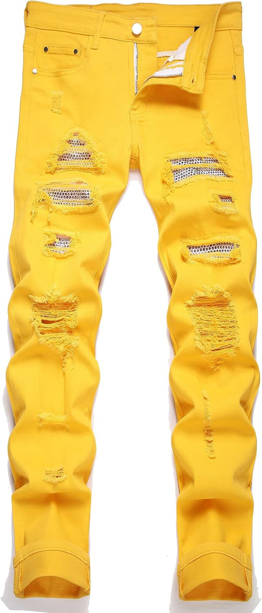 Men's Ripped Patch Elastic Jeans Fashion Slim Fit Regular Denim Pants