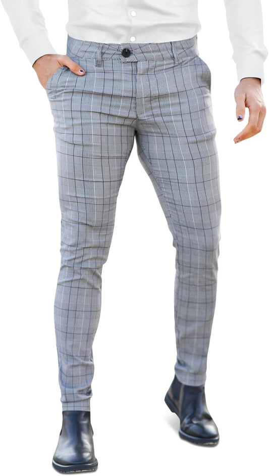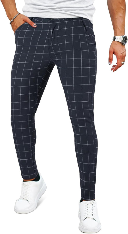 Mens Plaids Stretch Chino Pants Slim Fit