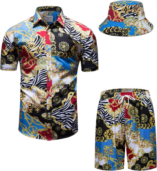 2 Piece Chain Print Baroque Button Down Suit with Bucket Hats
