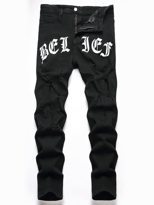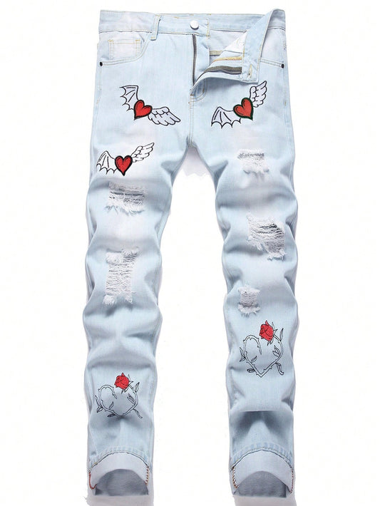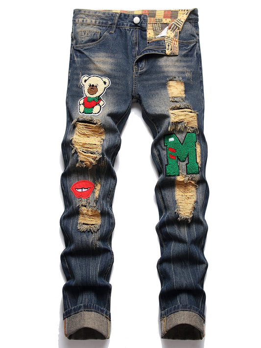 Men Cartoon & Letter Patched Detail Ripped Frayed Jeans