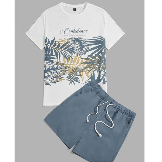 Men's Letter & Tropical Print Tee and Shorts Set