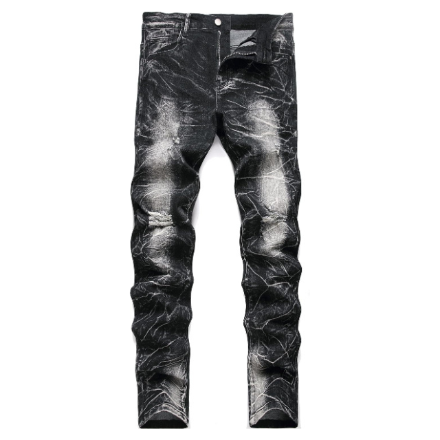 - VERSATILE DESIGN ELEMENTS. Sporting a distressed, ripped aesthetic, these slim fit jeans for men add a touch of edginess to your wardrobe. The strategically placed rips and distressing details lend a fashionable, lived-in feel, making them a statement piece for both casual and dressy ensembles.